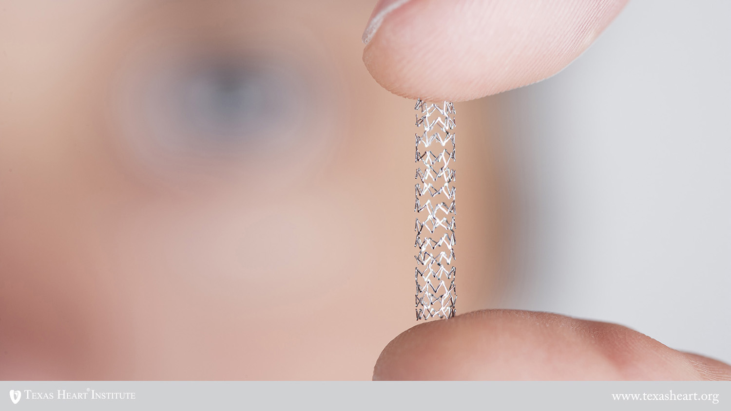 Man's hand holding a stent between forefinger and thumb in front of his eye. Selective focus on the stent. This is a small stent for coronary arteries.have a look at different variations: