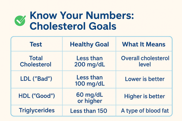 Managing cholesterol is not just about numbers on a lab report, it’s about protecting your arteries, keeping your heart healthy, and lowering your risk of life-threatening disease. Cholesterol is a key part of your heart health story. By knowing your numbers and working with your doctor, you can take steps today that protect your heart for years to come.